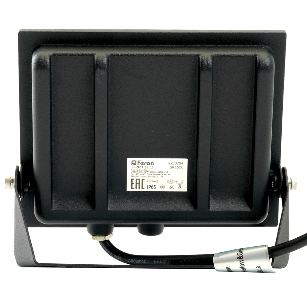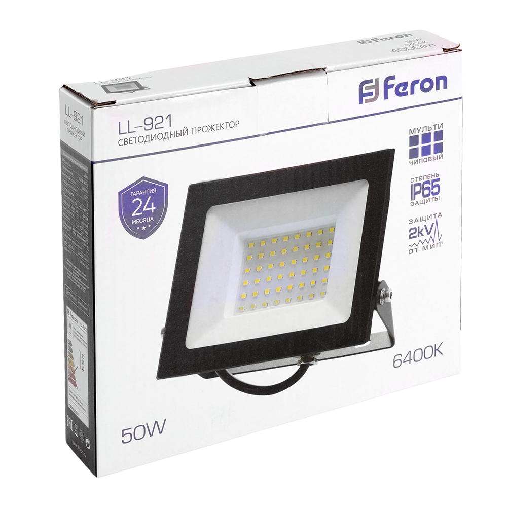 Прожектор светодиодный многоматричный с монтажным креплением на кронштейн, (ДО) FERON LL-921, 50W, 6400К (холодный белый), 230V/50Гц, 5000Lm, IP65, угол рассеивания 120°,*SMD2835, раб.t -40°C - +40°C, цвет чёрный, корпус алюминий литой под давлением + стекло, 174*151*29 мм