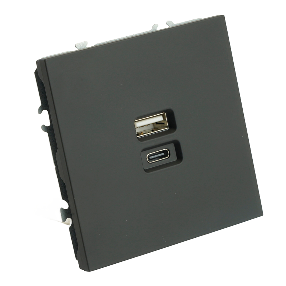 Розетка STEKKER RST10-5115-05 на USB Type A + Type C гнездо, -, -. Материал: поликарбонат, латунь, сталь, цвет черный уголь, soft touch, размер 71*71*41мм. Номинальное напряжение 250, номинальный ток 3A, диапазон рабочих температур 0..+35°C, 20