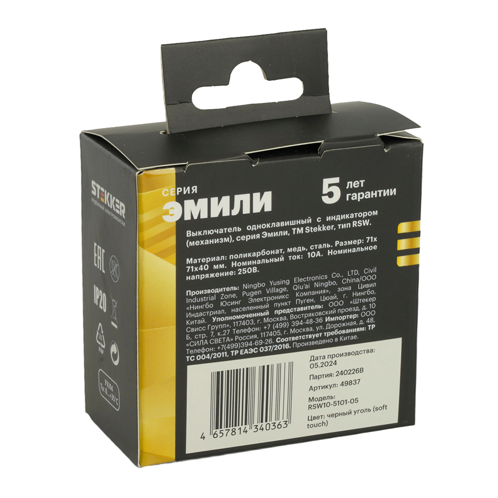 Выключатели одноклавишный STEKKER RSW10-5101-05, серия Эмили, с подсветкой (белый), тип установки - скрытой установки, размер изделия 71*71*40мм., цвет черный уголь, soft touch, материал изделия поликарбонат, латунь, сталь. Номинальное напряжение 250 , номинальный ток 10А, 20