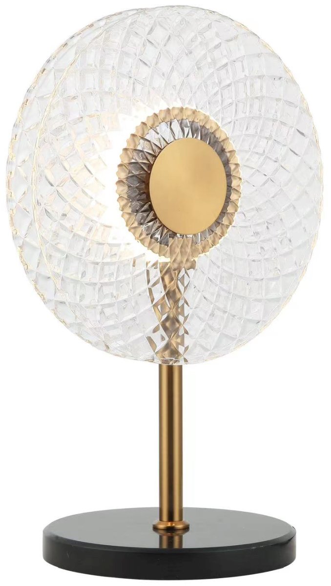 Светильник настольный Portu / Порту выполнен из металла, гальванизированного в бронзовый цвет. Светильники декорированы оригинальным плафоном из двух стеклянных фактурных элементов в виде круга. В основе настольной лампы используется мрамор. Данная коллекция идеально сочетается с коллекцией Sportu / Спорту.