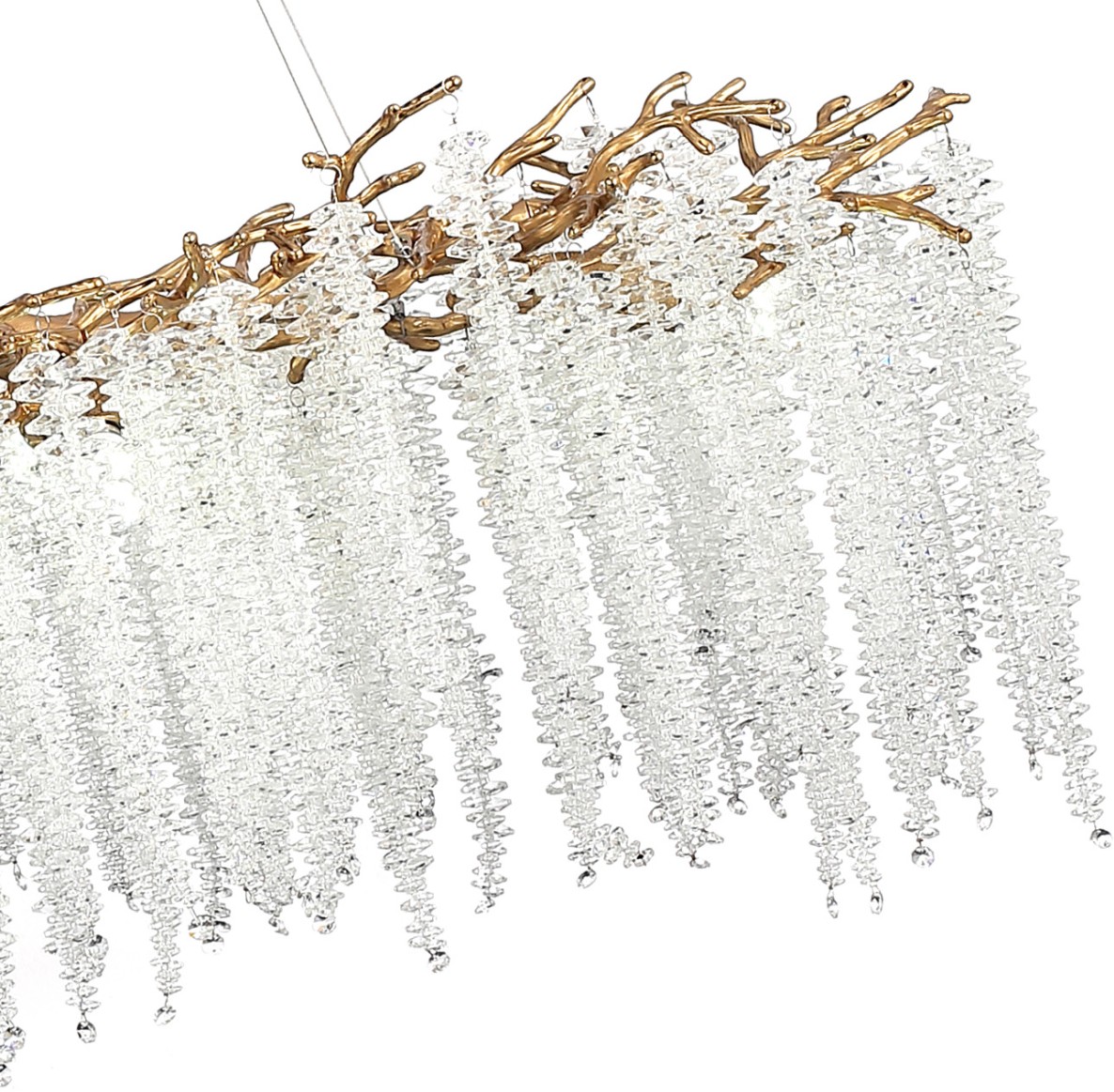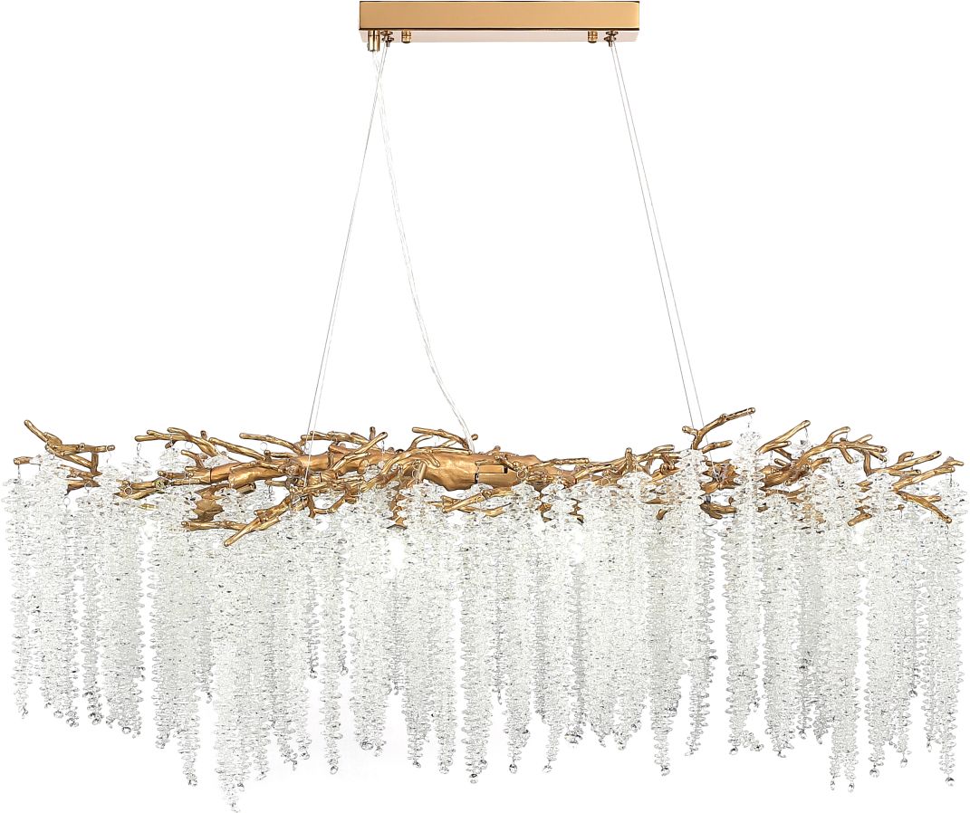 Люстра подвесная вытянутой формы коллекции Eiva / Эйва выполнена из сплава алюминия, гальванизирована в цвет бронзы и декорирована гроздьями из хрусталя в форме октагон. Светильники отличает увеличенное количество хрусталя (120 хрустальных гроздьев), фактурная чеканка на потолочной чаше и лампы с цоколем Е14. Из данной коллекции светильников можно сделать индивидуальный заказ любого цвета и размера.